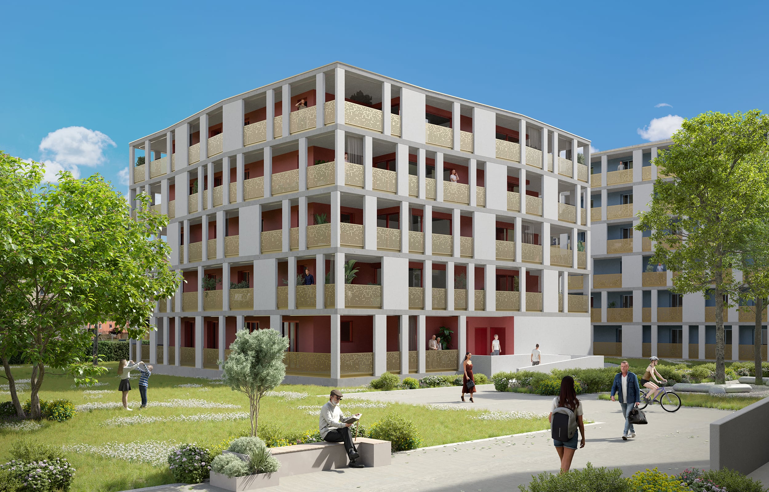 Les bâtiments sont soigneusement intégrés dans leur environnement, avec des matériaux de construction choisis pour garantir la durabilité et la qualité du projet. Les façades en béton, délibérément décalées et agrémentées de volumes disjoints, confèrent à l’ensemble architectural un aspect dynamique et harmonieux. Ce projet s’inscrit également dans une démarche écologique, avec l’installation de panneaux solaires et un raccordement au système de chauffage à distance, contribuant ainsi à une gestion énergétique optimisée et respectueuse de l’environnement.